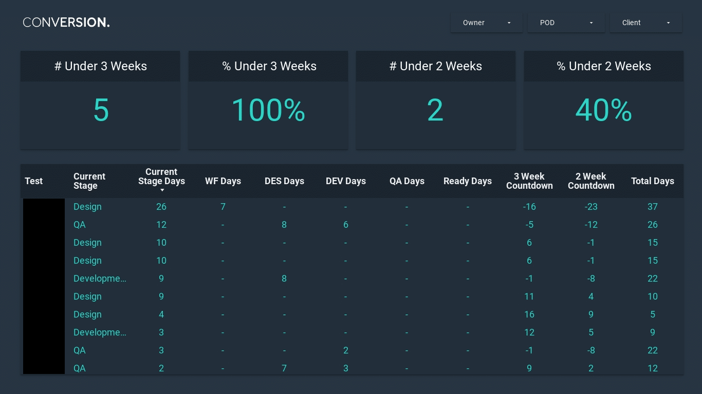 Below is an example of one of the first dashboards we put together to report on our velocity. It contains the number and percentage of experiments that we launched in less than three weeks, and the number and percentage that we launched in less than two.