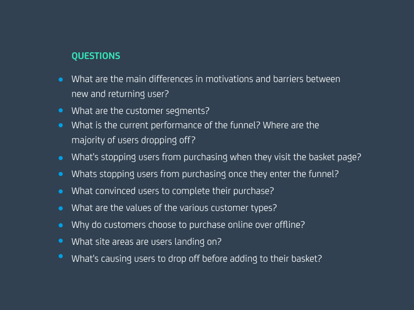When conducting research to generate insight, we use what we call a question-led approach. Any piece of research we conduct must have the goal of answering a specific question. We identify the questions we need to answer about a client’s business and their website and then conduct only the research we need to answer them. Taking this approach allows us to be efficient, gaining impactful and actionable insights that can drive our experimentation program.