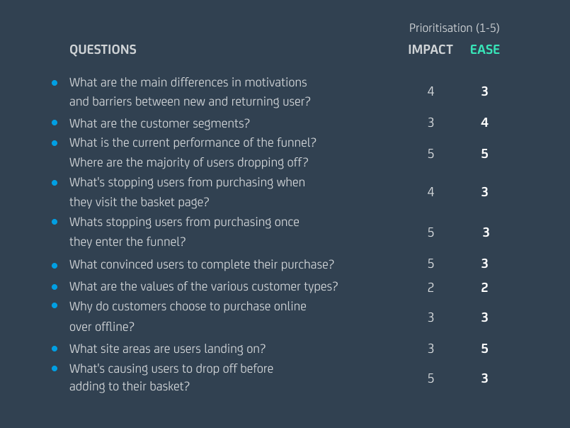 For example, a question like “What elements in the navigation are users interacting with the most?” might be a ‘nice to know’. However, if we don’t expect a navigation experiment to be one we would run any time soon, this may not be a ‘need to know’ and therefore wouldn’t be high priority. On the other hand, a question like “What’s stopping users from adding products to the basket?” is almost certainly a ‘need to know’. Answering this is very likely to generate insight that can be directly turned into an experiment. Rule of thumb is to prioritize the ‘need to know’ questions ahead of the ‘nice to know’.