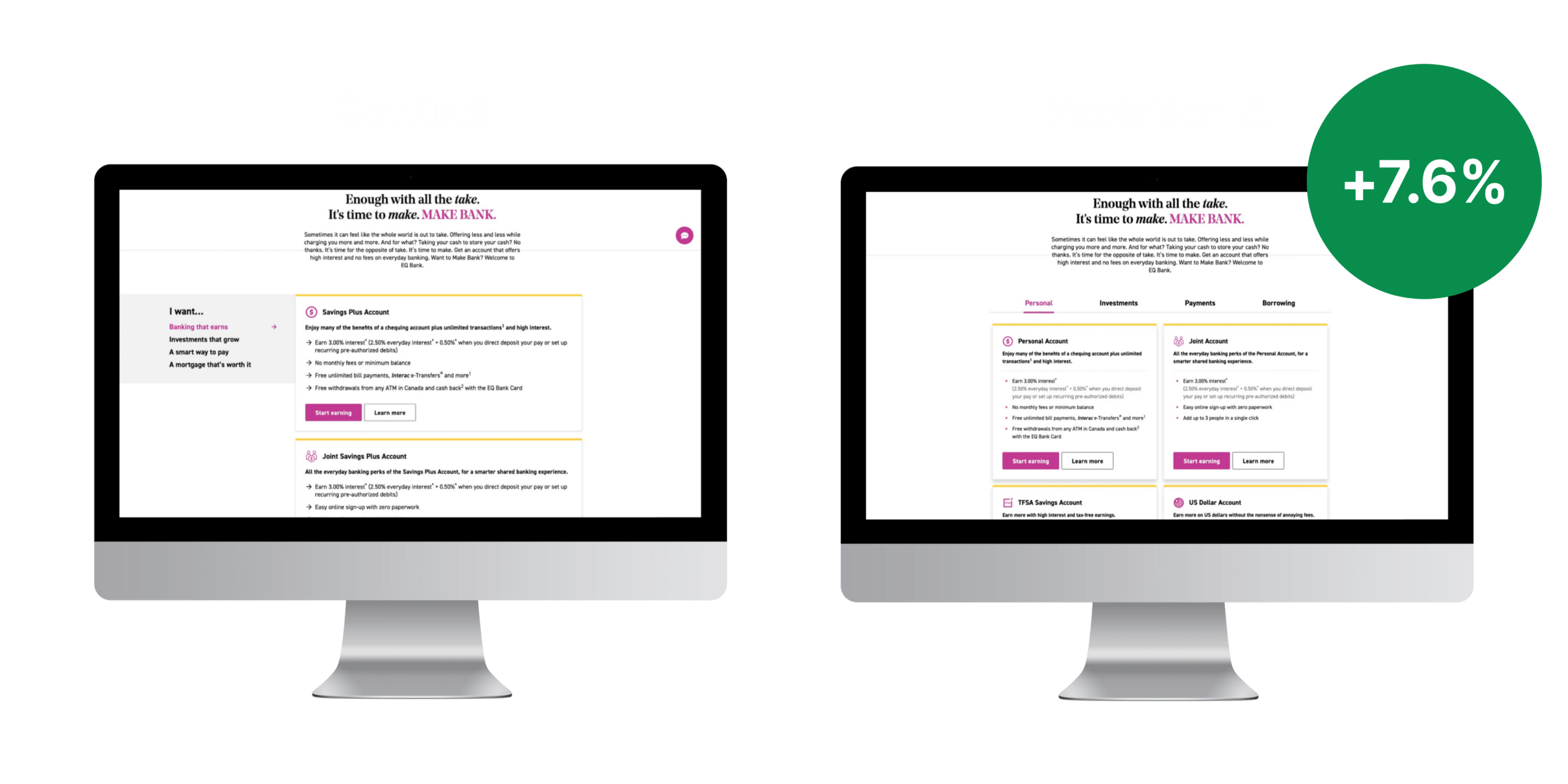 Like many websites, EQ Bank’s homepage included a carousel that rotated through a number of its most popular products. Our initial research suggested this was a worst-of-both-worlds approach, neither highlighting the bank’s value proposition nor showcasing its products.