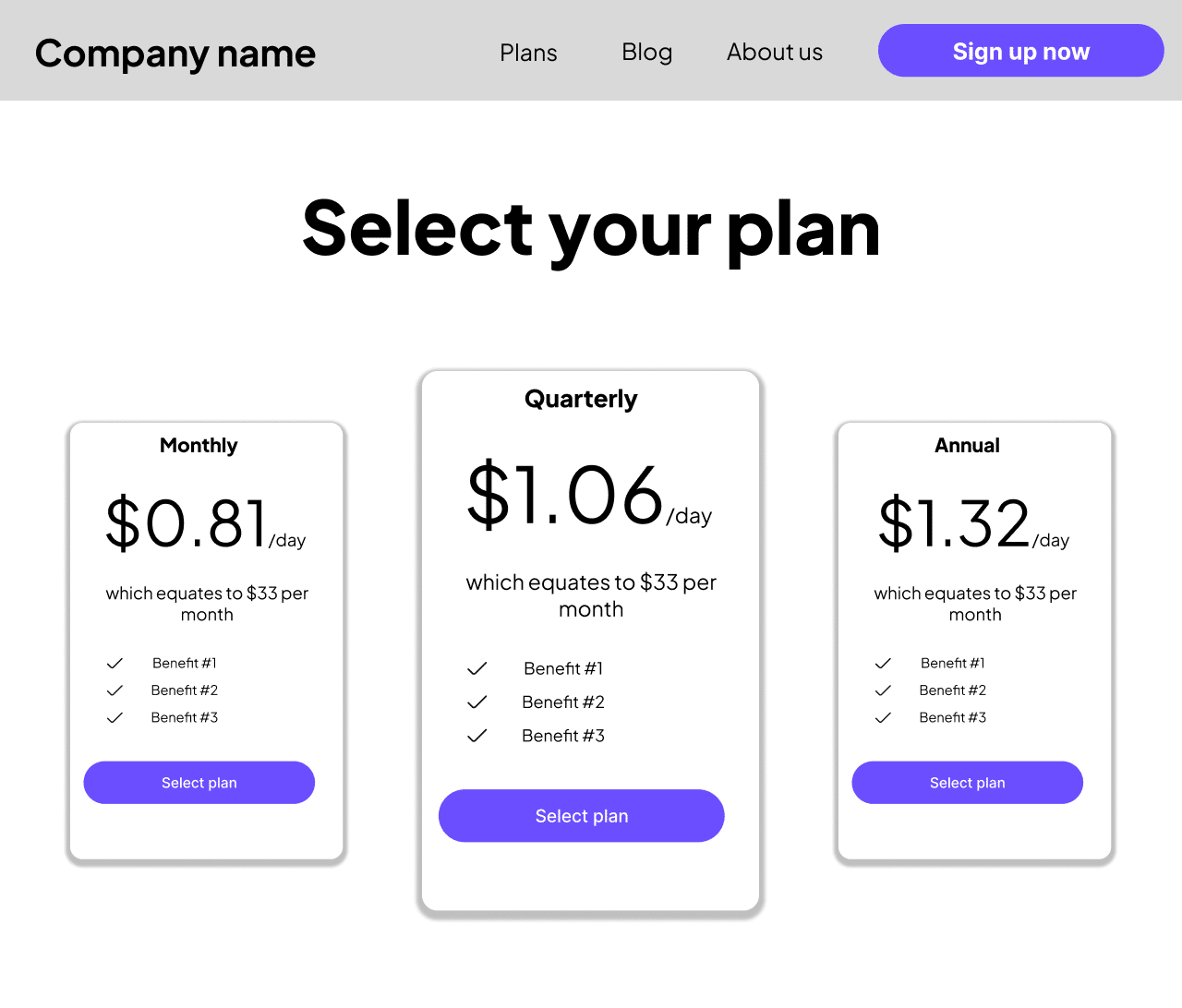 • Price framing is when the price of a product or service is positioned in a certain way to make it less or more appealing to customers, e.g. maybe you frame the price of your subscription product in terms of daily vs. monthly cost (like we’ve done here)