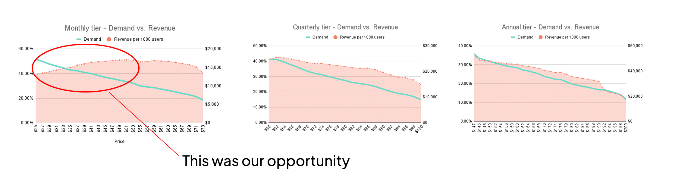 First, we ran a Gabor-Granger study on all three subscription tiers (monthly, quarterly and annual). This allowed us to map demand for each tier against revenue generated at each price point: