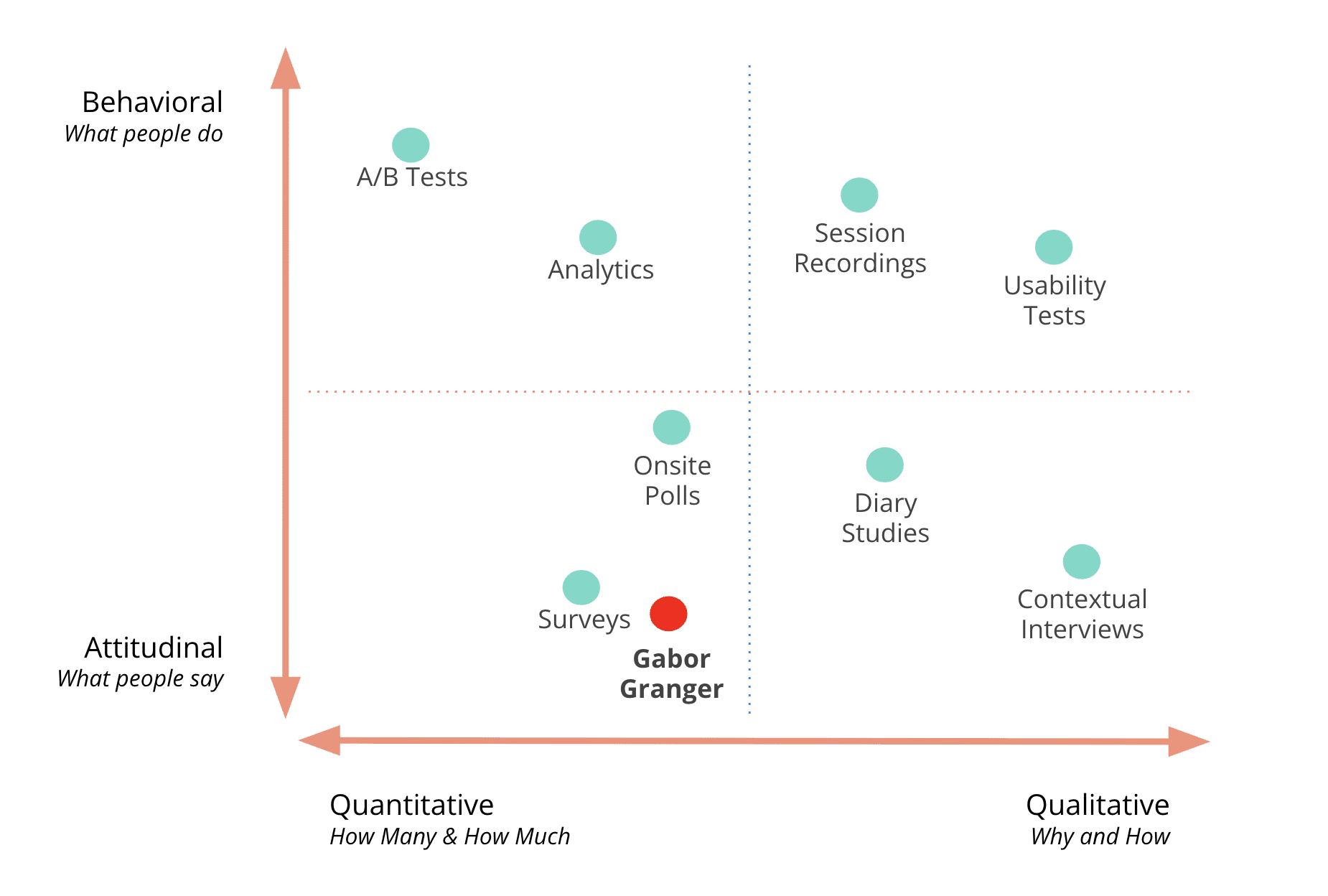 The best approach by far is mixed-method research. Instead of relying on one method (eg analytics), we triangulate opinion through multiple methods (eg analytics x surveys x usability tests).