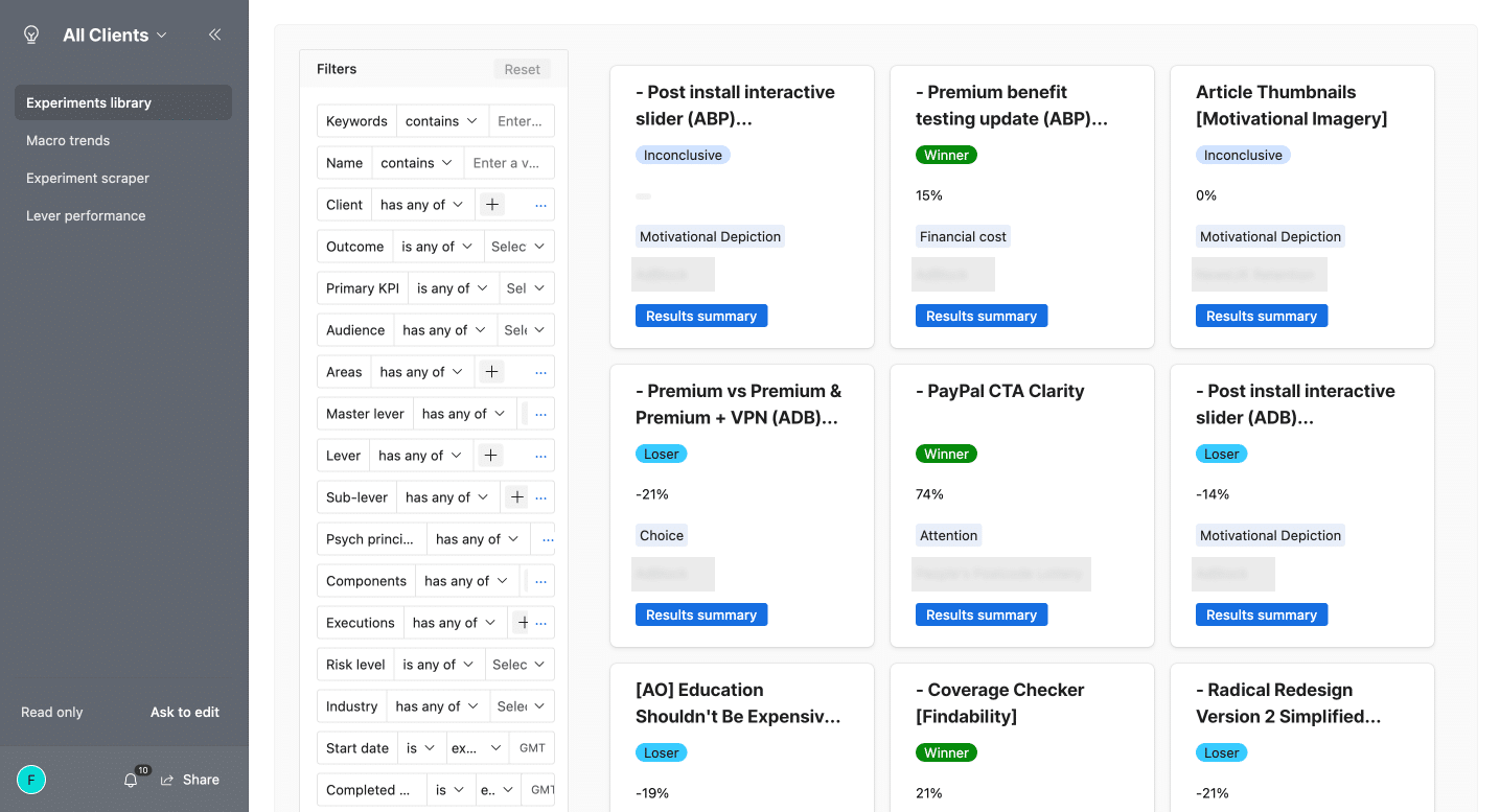 All of the data from within our main repository is filtered off into individual client repositories that contain only the tests and research insights that we’ve unearthed for each specific client.